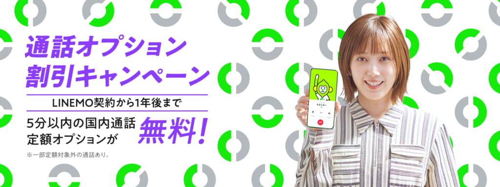 5分以内の国内通話が無料になる通話オプション「通話準定額」(税込550円/月)※1がLINEMO契約から1年後まで無料※2で利用できます。