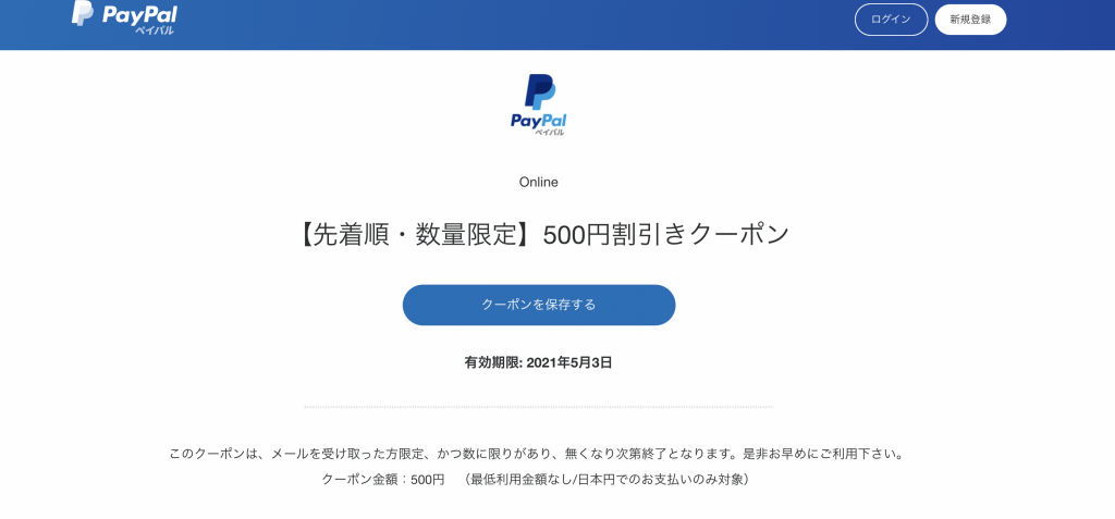 今回はPayPalの500円のクーポンが配布されているらしいのでこちらの方の解説です!
